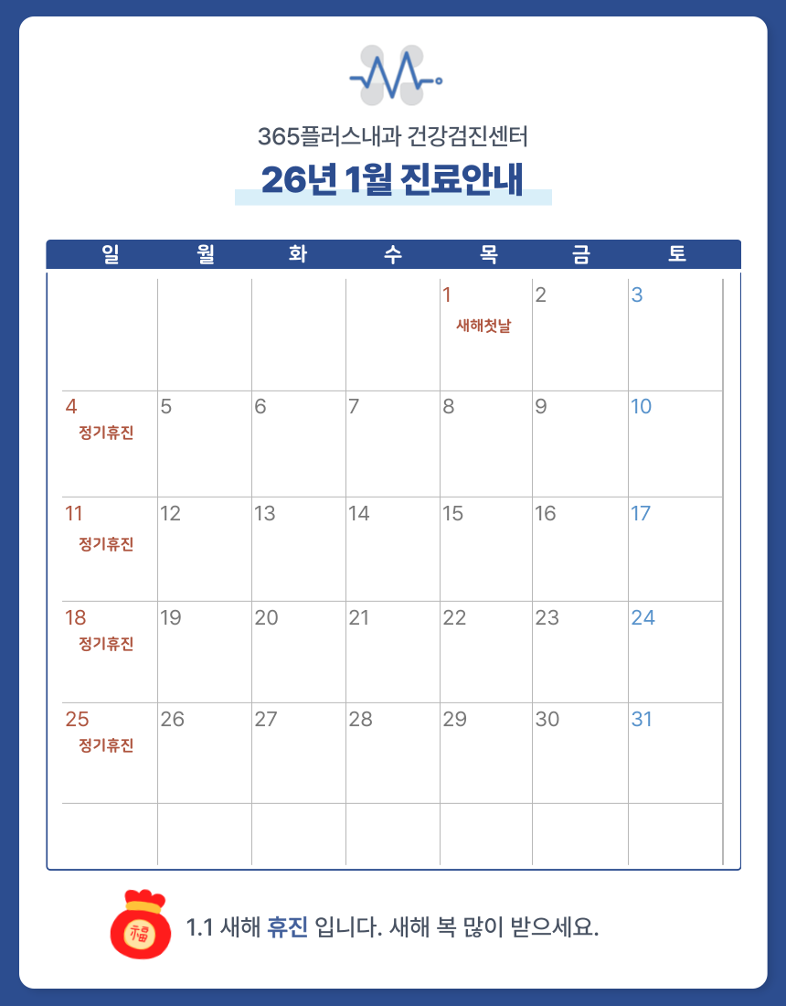365플러스내과는 신속하고 정확한 '검진 서비스' 뿐만 아니라,환자분들의 건강을 함께하는 '지킴이'가 될 것을 약속드립니다.