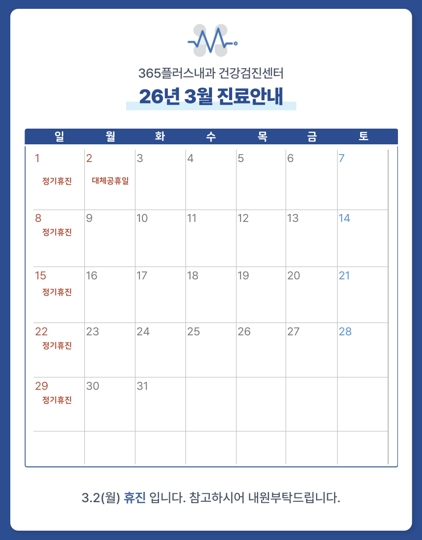 365플러스내과는 신속하고 정확한 '검진 서비스' 뿐만 아니라,환자분들의 건강을 함께하는 '지킴이'가 될 것을 약속드립니다.