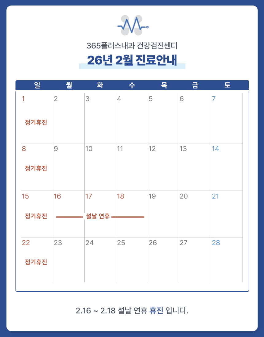 365플러스내과는 신속하고 정확한 '검진 서비스' 뿐만 아니라,환자분들의 건강을 함께하는 '지킴이'가 될 것을 약속드립니다.